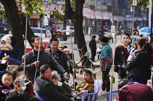 Parents hold their children for IV drips outside a clinic in Honghu, Hubei Province. Photo: IC