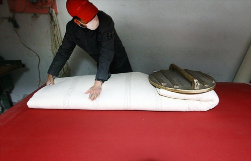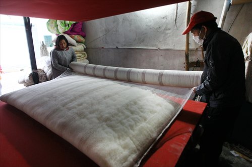 Xu's wife helps with a large quilt. Photo: Yang Hui/GT