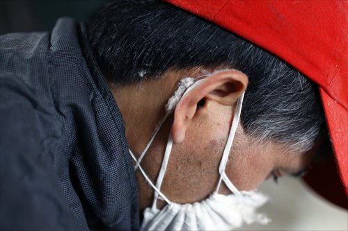 Xu at work with his mask and little pieces of fluff on his hair and ears Photo: Yang Hui/GT