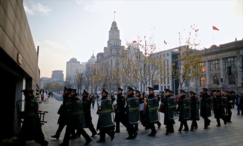 People's Armed Police Force officers patrol the Bund in Shanghai on Saturday following a fatal stampede on New Year's Eve. Photo: IC