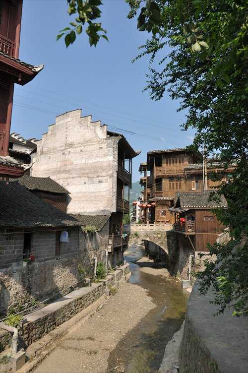 Houses along the Tuo River are quite different from those in the water towns of suburban Shanghai. They are called diaojiaolou, meaning stilted wooden houses standing over the water. Usually seen in Xiangxi and some mountain areas of Guizhou Province, diaojiaolou are a typical type of dwelling for the local ethnic groups.