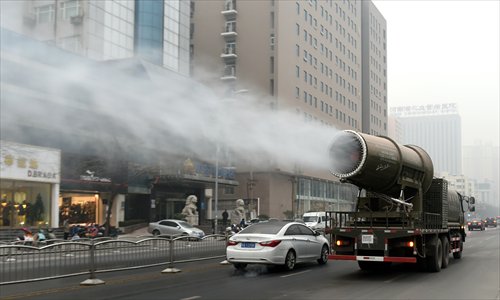 A truck carrying a giant water sprayer drives on the streets of Zhengzhou, Henan Province, Monday. The device aims to dissipate the city's smog with water vapor. Photo: CFP