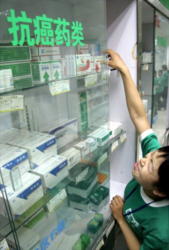 A shop assistant picks up some anti-cancer medicine in a pharmacy in Zhengzhou, Henan Province. Photo: IC