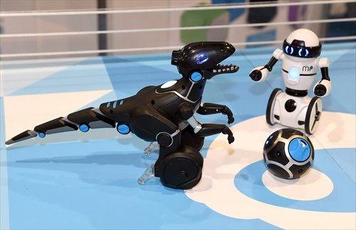 WowWee's new MiPosaur smart robot (left) and MiP's balancing commercial robot are displayed at the 2015 International Consumer Electronics Show (CES) on Tuesday in Las Vegas, Nevada. CES, the world's largest annual consumer technology trade show, features 3,600 exhibitors this year. Photo: AFP