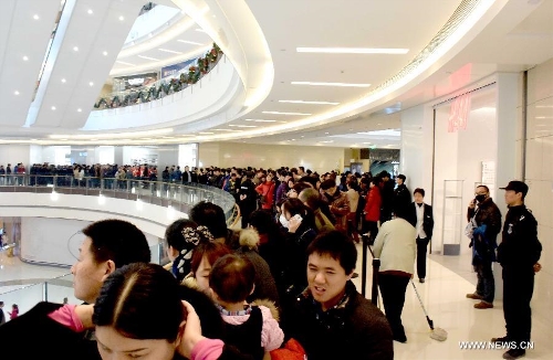 Customers wait outside a newly opened Apple Store in Zhengzhou, capital of central China's Henan Province, Jan. 10, 2015. Apple inaugurated its 13th directly-operated Apple Store in China on Saturday. (Xinhua/Zhu Xiang)