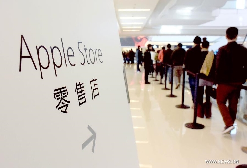 Customers wait outside a newly opened Apple Store in Zhengzhou, capital of central China's Henan Province, Jan. 10, 2015. Apple inaugurated its 13th directly-operated Apple Store in China on Saturday. (Xinhua/Li An)