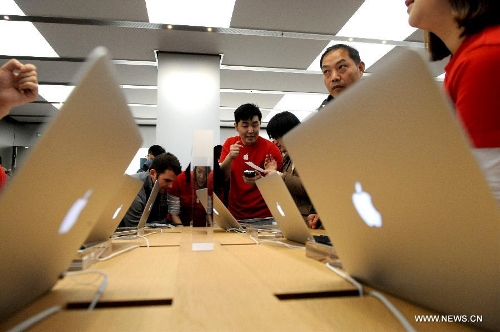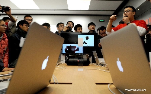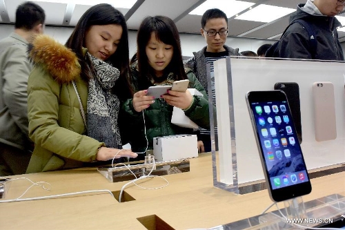 Customers try the Apple products at a newly opened Apple Store in Zhengzhou, capital of central China's Henan Province, Jan. 10, 2015. Apple inaugurated its 13th directly-operated Apple Store in China on Saturday. (Xinhua/Li An)