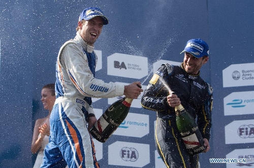 Winner Portuguese pilot Antonio Felix Da Costa (L) of Amlin Aguri team and second-place winner French pilot Nicolas Prost of e.dams-Renault team celebrate on the podium during the awarding ceremony of the Formula E Grand Prix on the street circuit in the city of Buenos Aires, Argentina, on Jan. 10, 2015. (Xinhua/Martin Zabala)