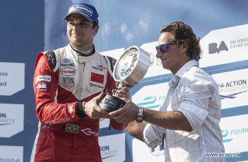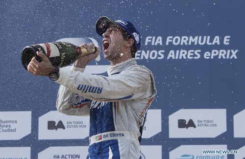 Portuguese pilot Antonio Felix Da Costa of Amlin Aguri Team celebrates during the awarding ceremony after winning the first place of the Formula E Grand Prix on the street circuit in the city of Buenos Aires, Argentina, on Jan. 10, 2015. (Xinhua/Martin Zabala)