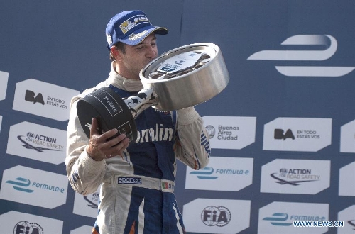 Portuguese pilot Antonio Felix Da Costa of Amlin Aguri Team celebrates with his trophy during the awarding ceremony after winning the first place of the Formula E Grand Prix on the street circuit in the city of Buenos Aires, Argentina, on Jan. 10, 2015. (Xinhua/Martin Zabala)