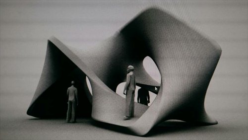 Yuan's Topological Surface is a giant glass-reinforced plastic installation that is a single surface twisted into an irregularly shaped structure. Robots were programmed to create the complicated shape. Through Topological Surface, people will see the possibility of spatial creation. Meanwhile, ICD-ITKE is also showcasing videos of their other robotic explorations in architecture, with buildings that react to their environment, for example, by automatically opening and closing its skin in response to humidity.
