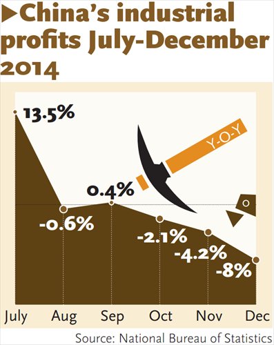 Industrial enterprises with more than 20 million yuan ($3.2 million) in annual revenue from core operations saw their profits shrink by 8 percent in December from the year before, the biggest monthly fall since the data gathering system was revised in late 2011, the National Bureau of Statistics (NBS) reported on Tuesday.