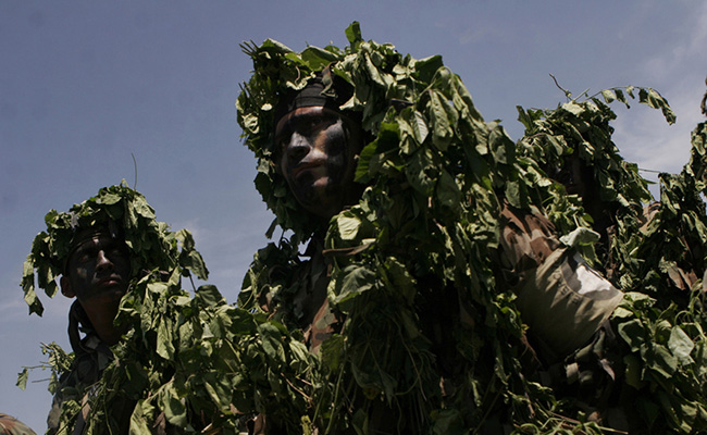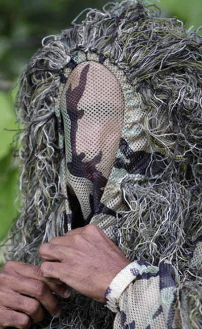 A man wears an Indian special forces camo suit during an international military defense exhibition in New Delhi on March 30, 2012. Photo: ifeng.com