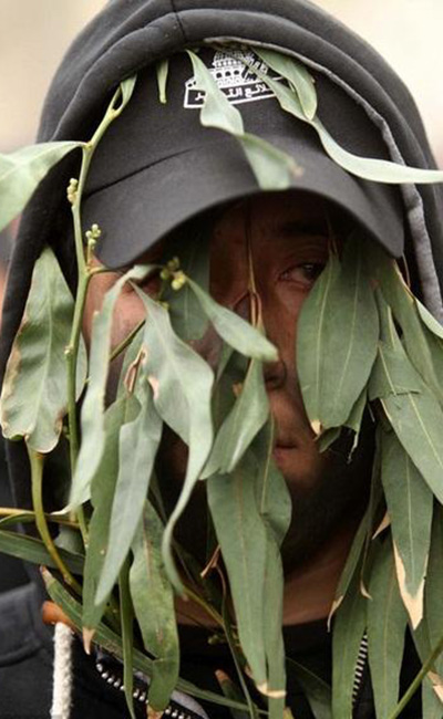A young Hamas soldier covers his face with leaves during a demonstration in Gaza on January 27, 2015. Photo: IC - hexun.com