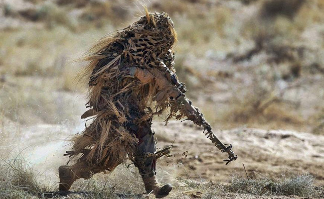 An Indian soldier completely covered in desert camouflage participates in a military exercise on December 5, 2011. Photo: ifeng.com