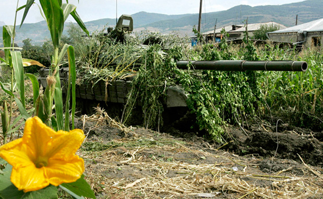 A Russian tank is covered with plants in South Ossetia on August 20, 2008. Photo: ifeng.com