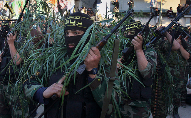 Islamic jihad militants wearing leafy branches march in Palestine. Photo: ifeng.com