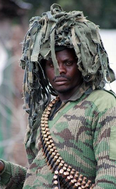 A soldier in Congo wears a camo headdress on July 17, 2013. Photo: ifeng.com