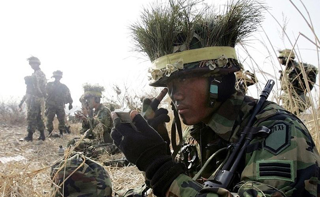 A South Korean soldier wears a helmet topped with grass during a military exercise in Yeoju on March 16, 2007. Photo: ifeng.com