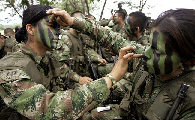 Soldiers paint face camouflage on each other in Melgar, Columbia on May 12, 2009. Photo: ifeng.com