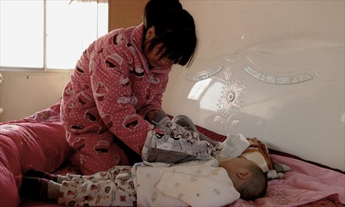 Xiong's mother changes the boy's clothes at their home in Anhui Province on January 22. Photo: CFP