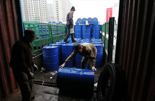 Workers load barrels of methane onto a truck bound for North Korea on January 25. Photo: Cui Meng/GT