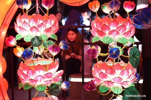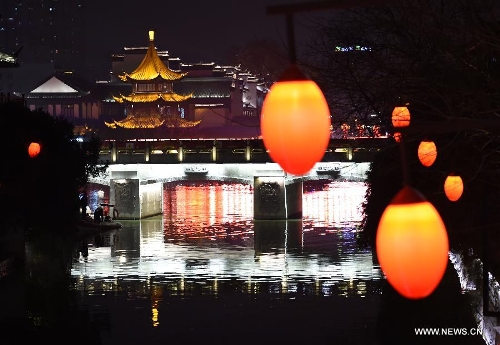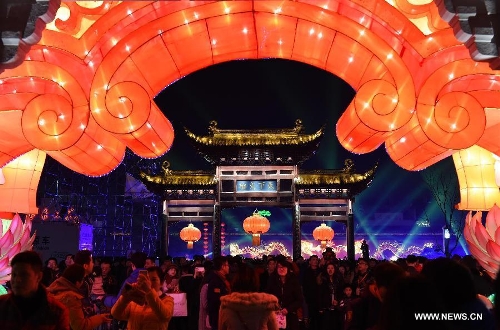 Visitors view lanterns at the Qinhuai Lantern Fair before the Confucius Temple in Nanjing, capital of east China's Jiangsu Province, Feb. 11, 2015. The 2015 Qinhuai Lantern Fair was inaugurated in Nanjing Wednesday evening. It will last for 50 days, with 66 large-scale lantern units and folk makers' lanterns in five exhibition areas. (Xinhua/Sun Can)
