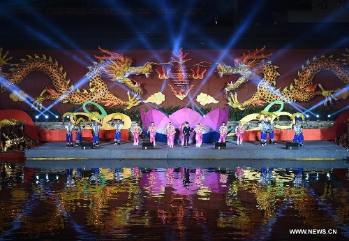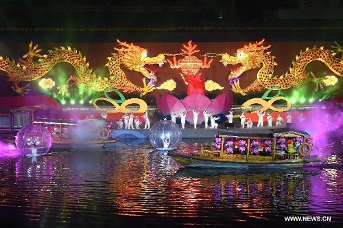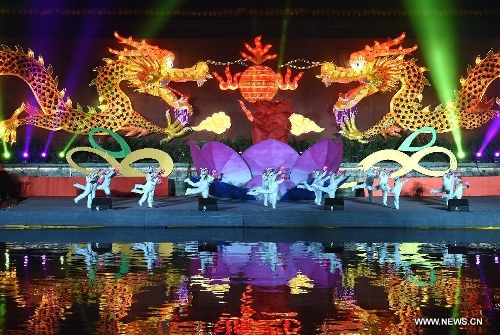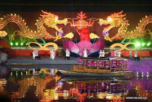 A performance is staged at the illumination ceremony of the Qinhuai Lantern Fair beside the Qinhuaihe River in Nanjing, capital of east China's Jiangsu Province, Feb. 11, 2015. The 2015 Qinhuai Lantern Fair was inaugurated in Nanjing Wednesday evening. It will last for 50 days, with 66 large-scale lantern units and folk makers' lanterns in five exhibition areas. (xinhuashe/Sun Can)