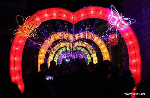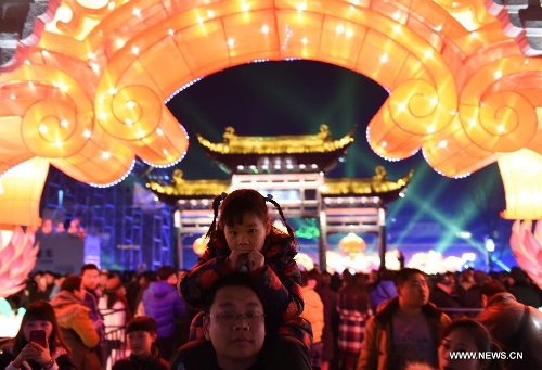 People visit the Qinhuai Lantern Fair in Nanjing, capital of east China's Jiangsu Province, Feb. 11, 2015. The 2015 Qinhuai Lantern Fair was inaugurated in Nanjing Wednesday evening. It will last for 50 days, with 66 large-scale lantern units and folk makers' lanterns in five exhibition areas. (Xinhua/Liu Jianhua)