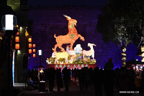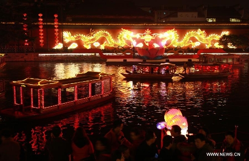 People visit the Qinhuai Lantern Fair in Nanjing, capital of east China's Jiangsu Province, Feb. 11, 2015. The 2015 Qinhuai Lantern Fair was inaugurated in Nanjing Wednesday evening. It will last for 50 days, with 66 large-scale lantern units and folk makers' lanterns in five exhibition areas. (Xinhua/Sun Can)