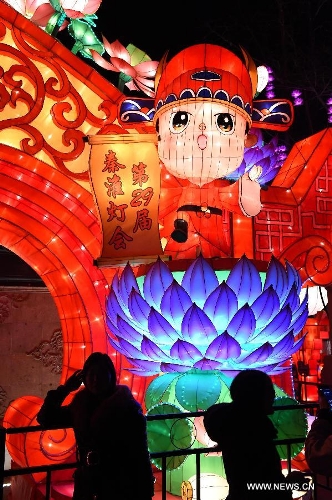 Visitors view lanterns at the Qinhuai Lantern Fair in Nanjing, capital of east China's Jiangsu Province, Feb. 11, 2015. The 2015 Qinhuai Lantern Fair was inaugurated in Nanjing Wednesday evening. It will last for 50 days, with 66 large-scale lantern units and folk makers' lanterns in five exhibition areas. (Xinhua/Sun Can)