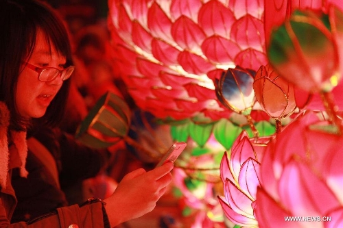A visitor takes photos with her phone at the Qinhuai Lantern Fair in Nanjing, capital of east China's Jiangsu Province, Feb. 11, 2015. The 2015 Qinhuai Lantern Fair was inaugurated in Nanjing Wednesday evening. It will last for 50 days, with 66 large-scale lantern units and folk makers' lanterns in five exhibition areas. (Xinhua/Liu Jianhua)