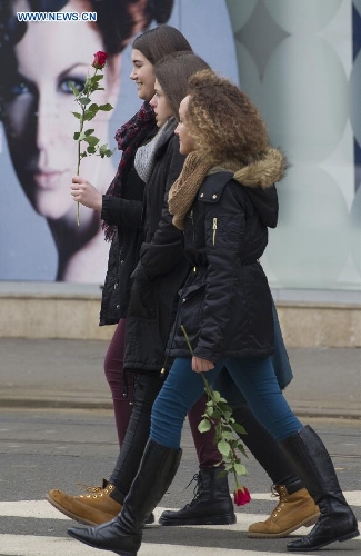 Girls with red roses are seen on the street on the Valentine's Day in downtown Zagreb, capital of Croatia, Feb. 14, 2015. (Xinhua/Miso Lisanin)