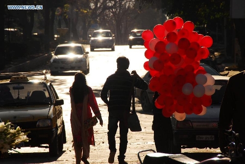 A Pakistani couple carrying balloons walk along a road on Valentine's Day in Islamabad, capital of Pakistan on Feb. 14, 2015. (Xinhua/Saadia Seher)