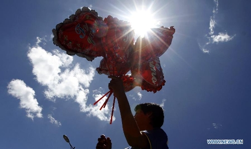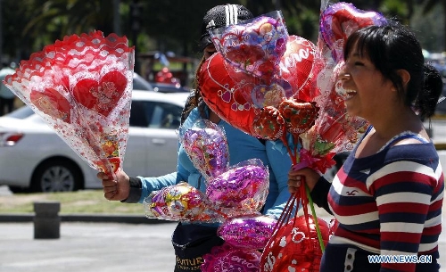 People sell heart-shaped balloons on the Valentine's Day in Quito, capital of Ecuador, on Feb. 14, 2015. (Xinhua/Str)