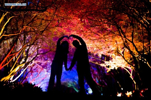 A couple make a heart-shaped gesture under the cherry trees near Riyue Tan, or the Sun Moon Lake, in Nantou County, southeast China's Taiwan, Feb. 13, 2015. (Xinhua/Jin Liwang)