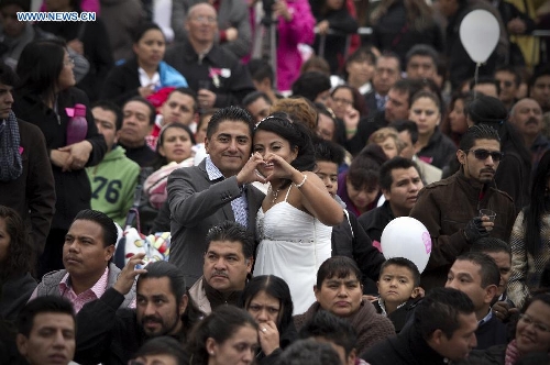 A couple poses during a collective wedding in Zocalo Square in Mexico City, capital of Mexico, on Feb. 14, 2015, the Valentine's Day. (Xinhua/Alejandro Ayala)