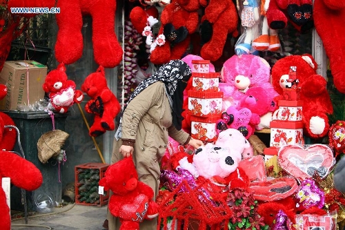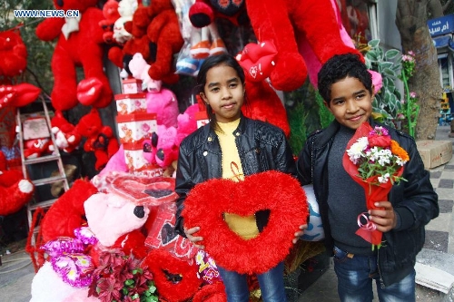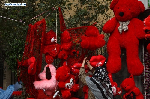 An Egyptian vendor displays gifts in front of a shop decorated for Valentine's Day in Cairo, Egypt, Feb. 14, 2015. (Xinhua/Ahmad Gomaa)