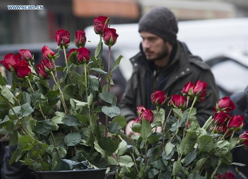 A bunch of red roses is seen at a flower market on the Valentine's Day in downtown Zagreb, capital of Croatia, Feb. 14, 2015. (Xinhua/Miso Lisanin)