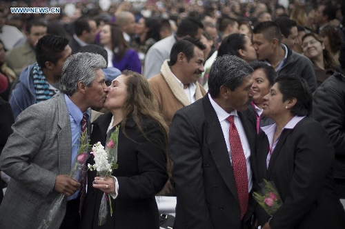 Couples kiss during a collective wedding in Zocalo Square in Mexico City, capital of Mexico, on Feb. 14, 2015, the Valentine's Day. (Xinhua/Alejandro Ayala)
