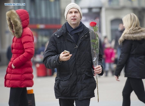 A man with a red rose is seen at a flower market on the Valentine's Day in downtown Zagreb, capital of Croatia, Feb. 14, 2015. (Xinhua/Miso Lisanin)