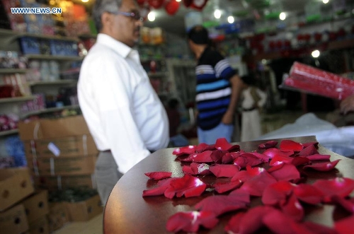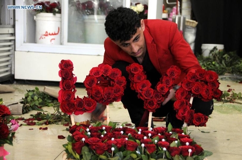 A Yemeni man prepares flowers for customers on the Valentine's Day in Sanaa, Yemen, Feb. 14, 2015, amid the political and economical unrest the country has witnessed. (Xinhua/Hani Ali)