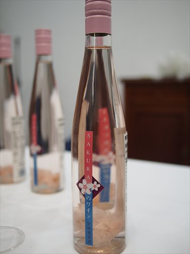 Wines produced in Yamanashi Prefecture sit on display at a promotional event Thursday.