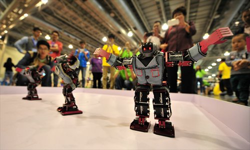 Robots designed by students dance on stage at the China Robot Competition, October 10, 2014. Photo: IC