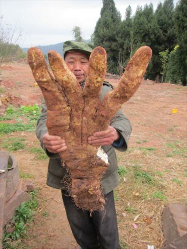A farmer in Deyang, Sichuan Province has earned applause for harvesting a gigantic 15-kilogram yam that resembles a hand, newssc.org reported Monday.