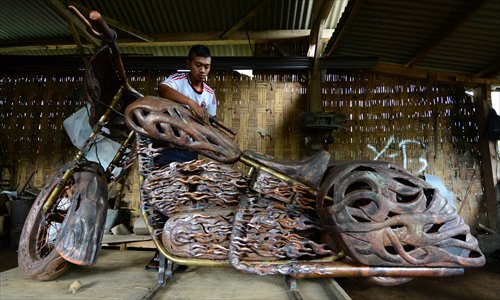 A craftsman puts the finishing touches on a replica Harley Davidson motorcycle made of copper and brass at the AA Gallery workshop on Monday in Boyolali, Central Java, Indonesia. Each replica bike takes about two months to build. This replica will be sent to Europe. Photo: CFP