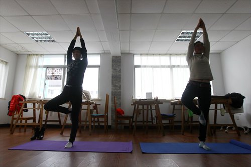 On a break these artists practice yoga. Photo: Yang Hui/GT