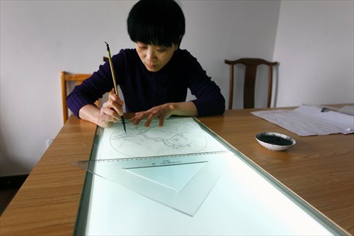 Embroiderer Zhuang Meiquan carefully draws an outline for a new piece. Photo: Yang Hui/GT