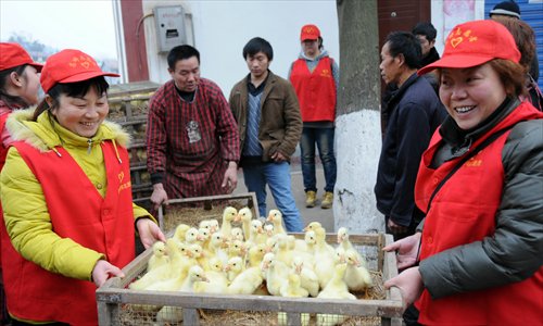 Oxfam donates 2050 goslings to residents at Fomen township near Nanchong, Sichuan Province, January 30, 2013. Photo: IC