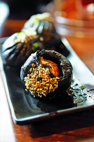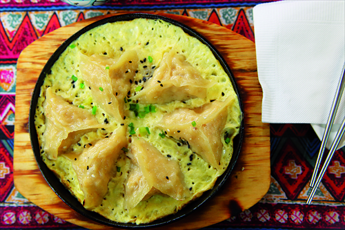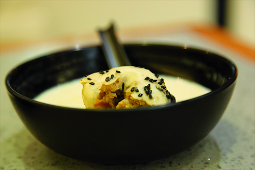 shengjian is a specialty of the restaurant. Their outer coating is made with black rice and stuffed with cheese and codfish. A chef at the restaurant said that the stuffing is boiled in small pots, rather than the larger ones that are normally used, for a more tender taste.